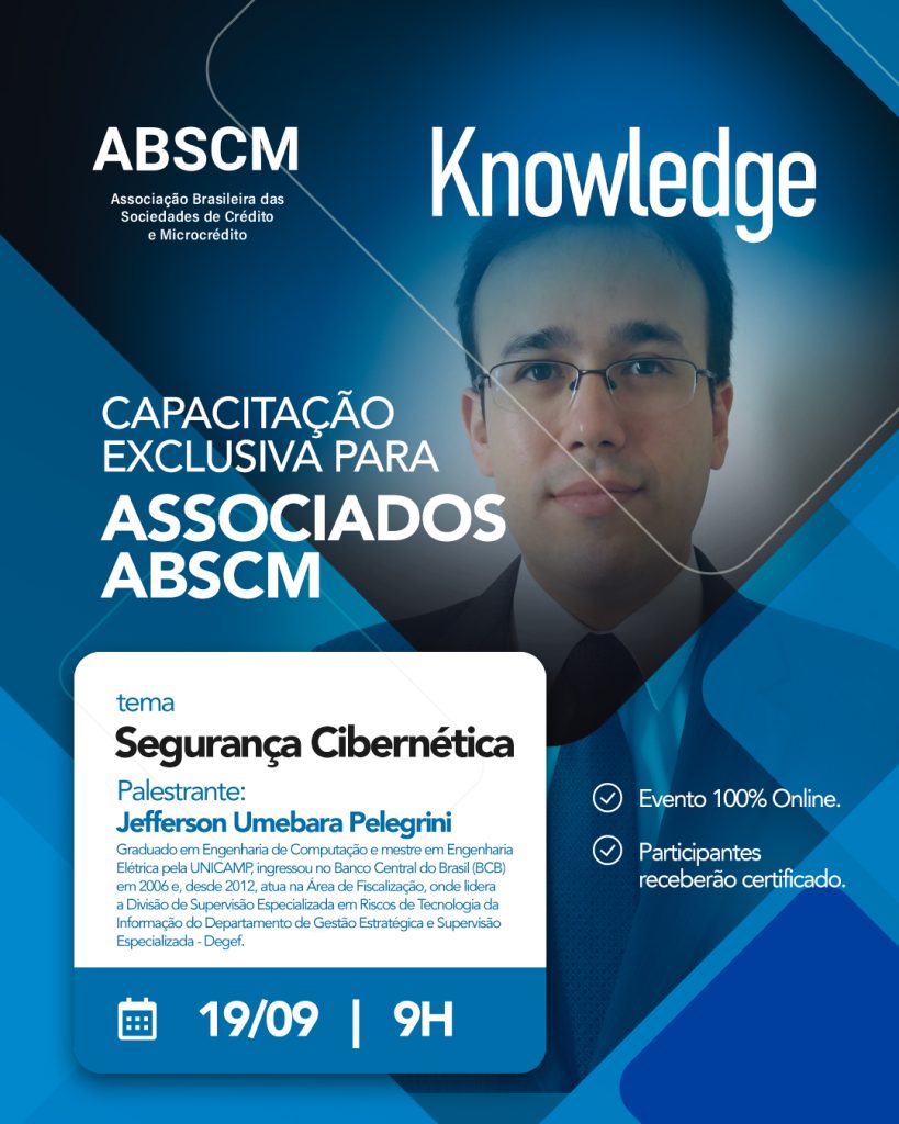 O palestrante convidado é Jefferson Umebara Pelegrini, líder da Divisão de Supervisão Especializada em Riscos de Tecnologia da Informação do Departamento de Gestão Estratégica e Supervisão Especializada (Degef).